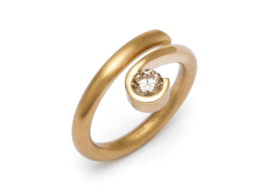 Der Ring aus 750 Gelbgold besitzt ein rundes Ringprofil dessen Ende flach geschmiedet wurde. Wie selbstverständlich legt sich das Band um den Stein und fasst ihn sicher.