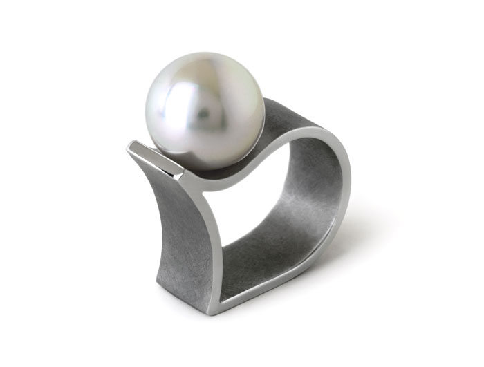Die Assoziation von Perle zu Wasser ist naheliegend. Wie eine Welle umfließt dieses flächige Band den Finger und bettet die Perle geschützt in sein Wellental. Die schwungvolle aufsteigende Linie gibt dem Ring einen guten Halt zum Nebenfinger und einen angenehmen Tragekomfort.