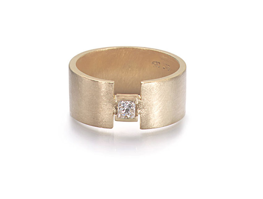 Das quadratische Profil der Ringes winkelt sich aus der Ringschiene und umfaßt so einen quadratischen Diamanten.
